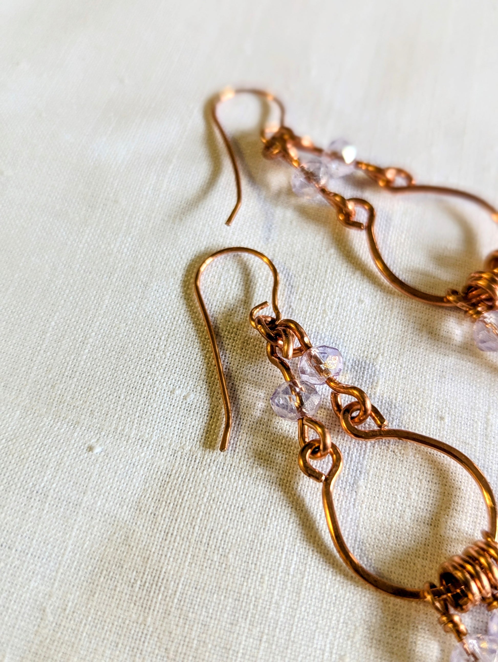 Make a statement with Felicity Earrings! These Copper hammered crystal chandelier hoops will elevate any look. With playful dangles and a unique design, they add a touch of fun and fashion to any outfit. Perfect for a quirky and stylish individual!
