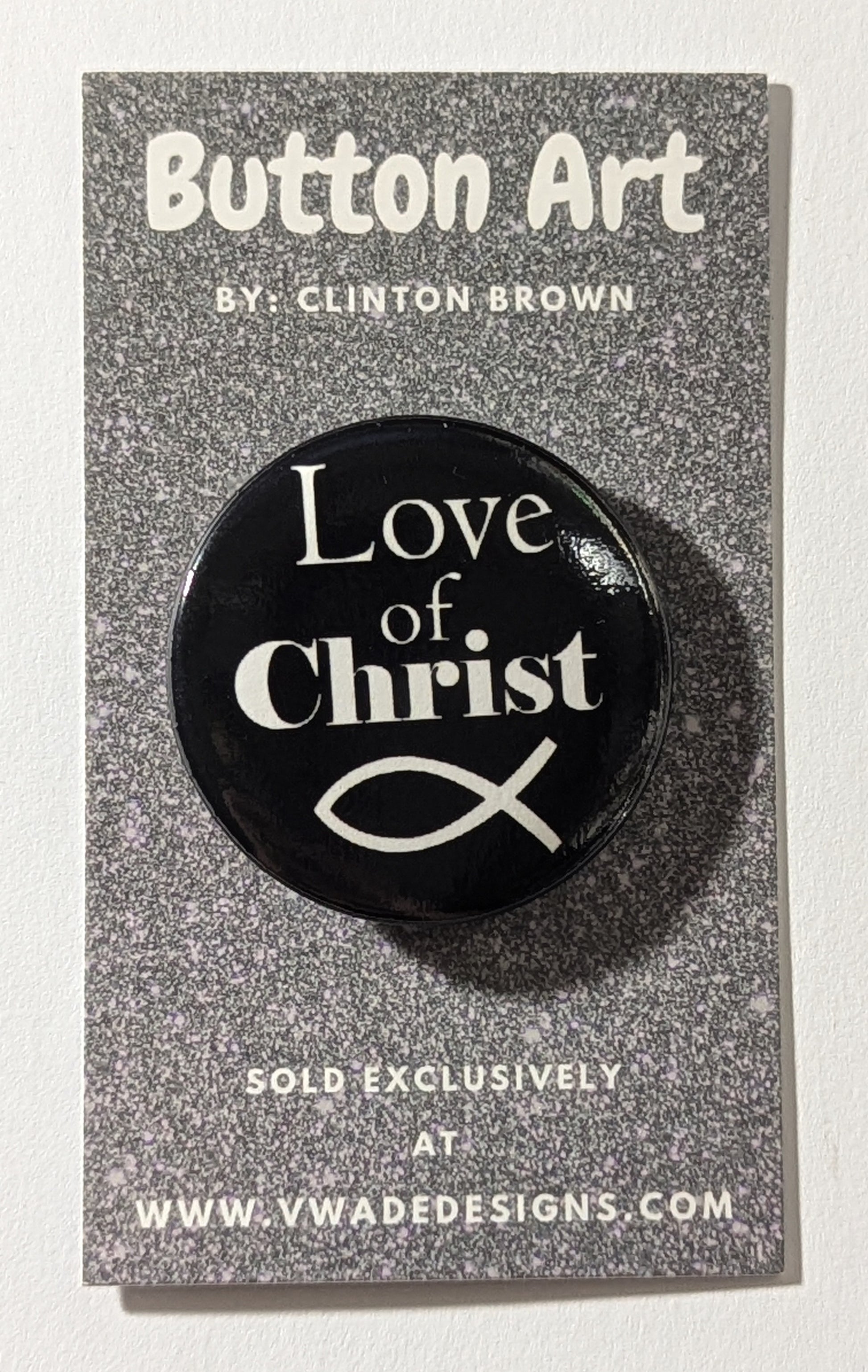 Exclusive design pin back button pin. 1.5 inch, with included scripture card. Share the joy of following Jesus.