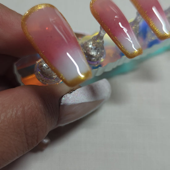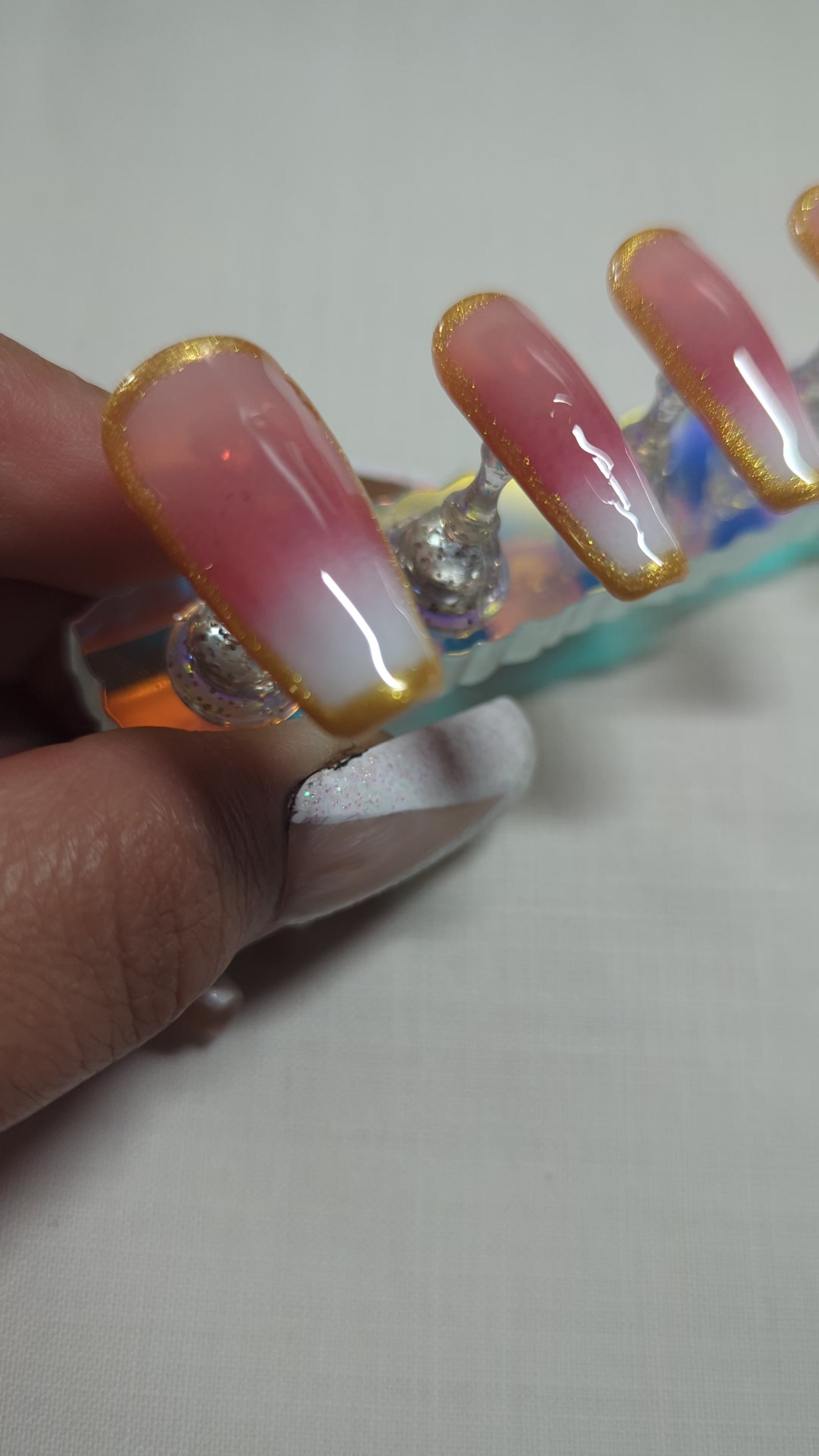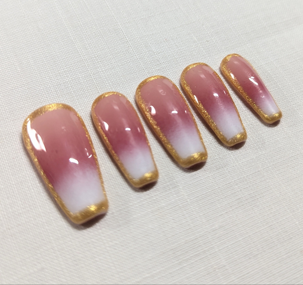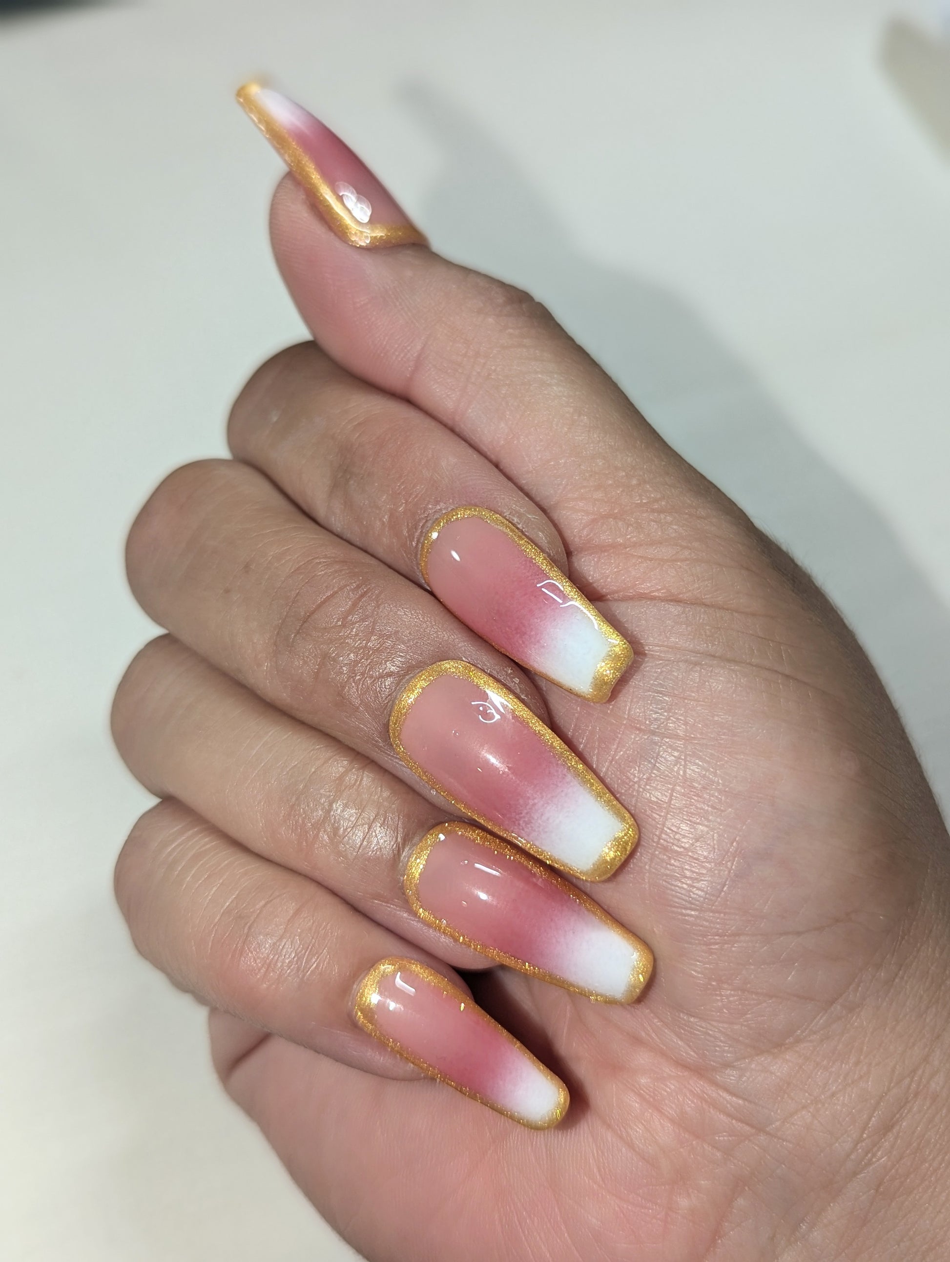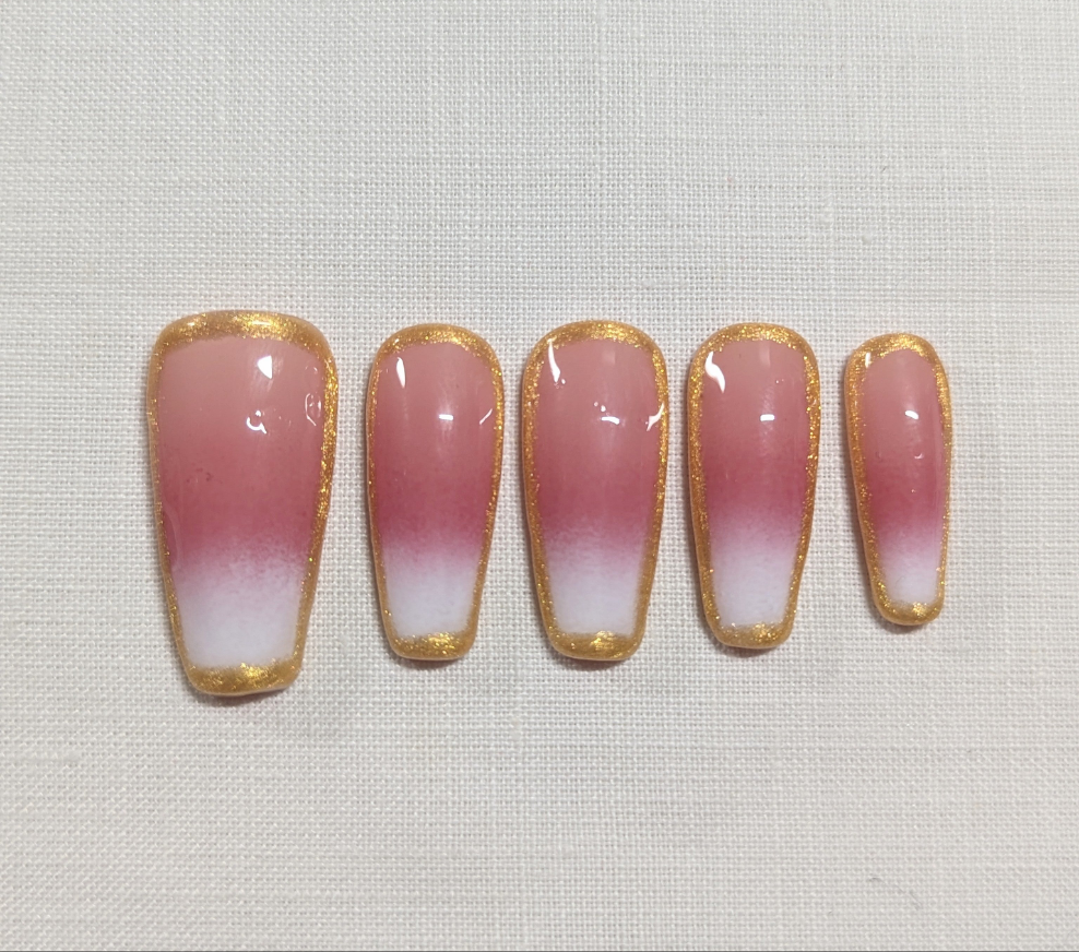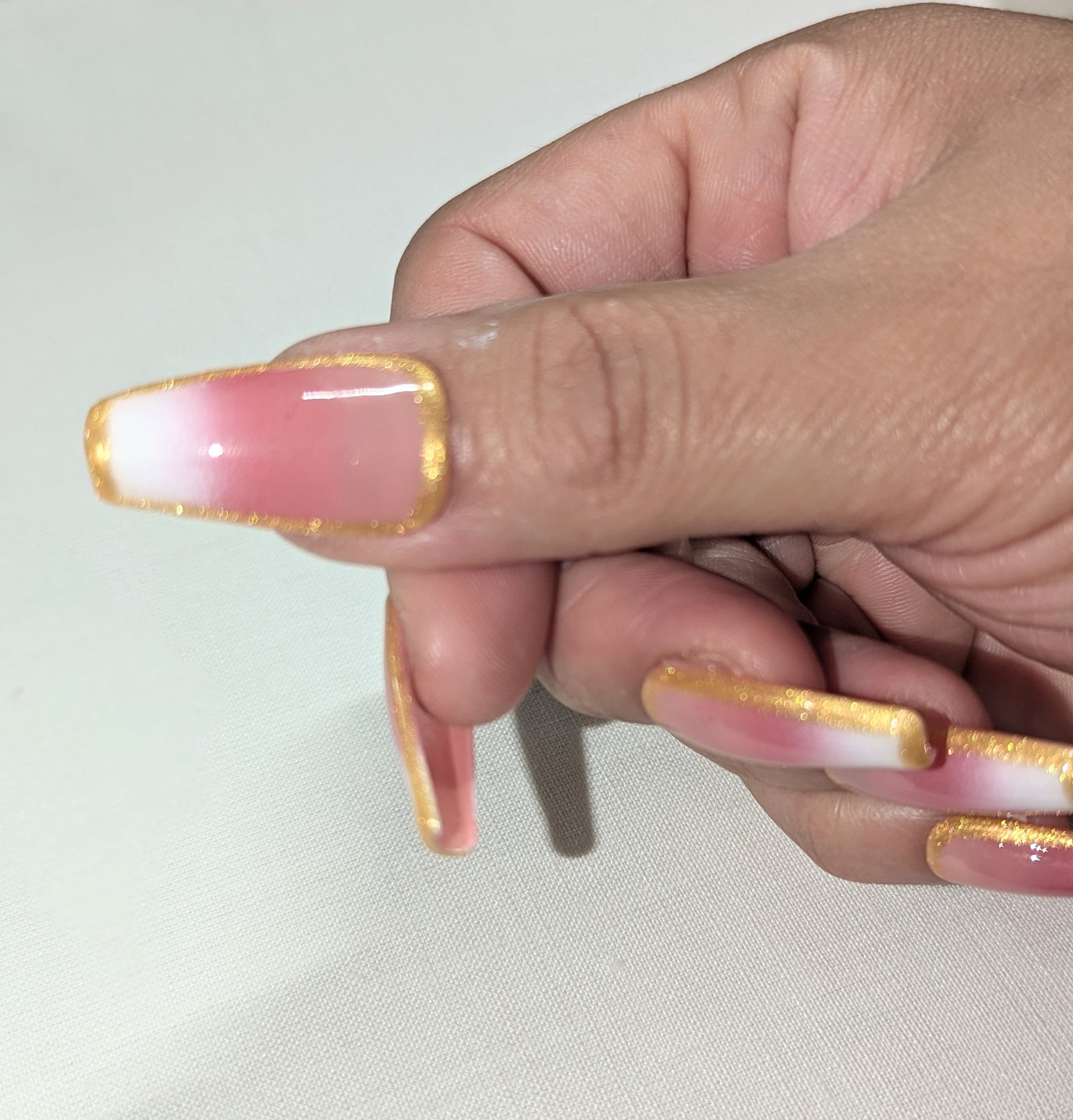 "These nails are the perfect accessory for your flirty and fun side. The pink and white ombre design adds a touch of sweetness, while the gold trim adds a touch of elegance. Get ready to make a statement with these stylish press on nails!" Long coffin shown in picture.