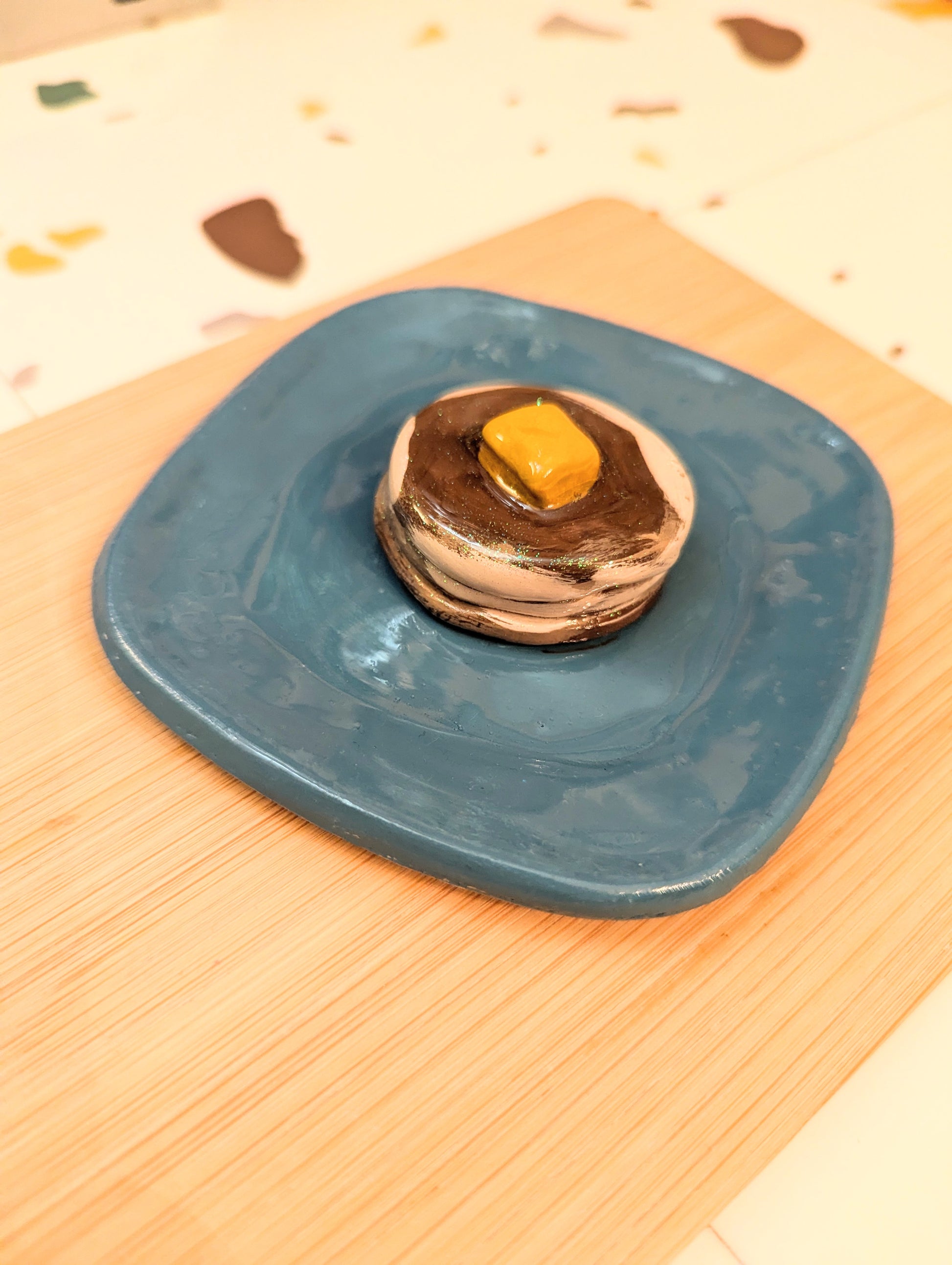 Store your trinkets in this one-of-a-kind handmade tray, featuring deliciously detailed clay pancakes coated in resin for long-lasting use. Perfect for adding a touch of quirkiness to your dressing table. (Warning: may cause cravings for actual pancakes!)