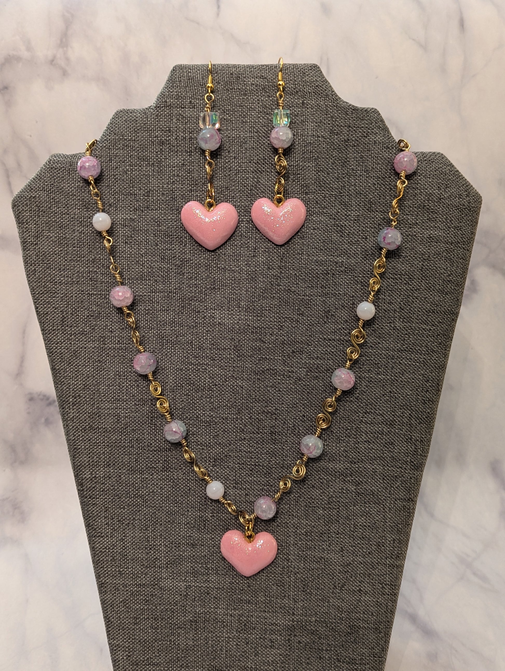 Our pink love set includes earrings and a necklace. The necklace is 20 in Long with a clay heart charm. Each length is handmade with a handmade clasp that can be done either left or right-handed. The earrings on stainless steel ear wires, gold tone and the metals used are brass. Each heart charm is clay hand-painted and covered with resin for durability. Your beads are a mixture of Czech glass and Swarovski Crystals. The links are durable, they are created into one another so they won't fall apart or come loose. Is sure to be a set that will last you a lifetime, with proper care. A care card will be included in a velvet pouch to store your jewelry.