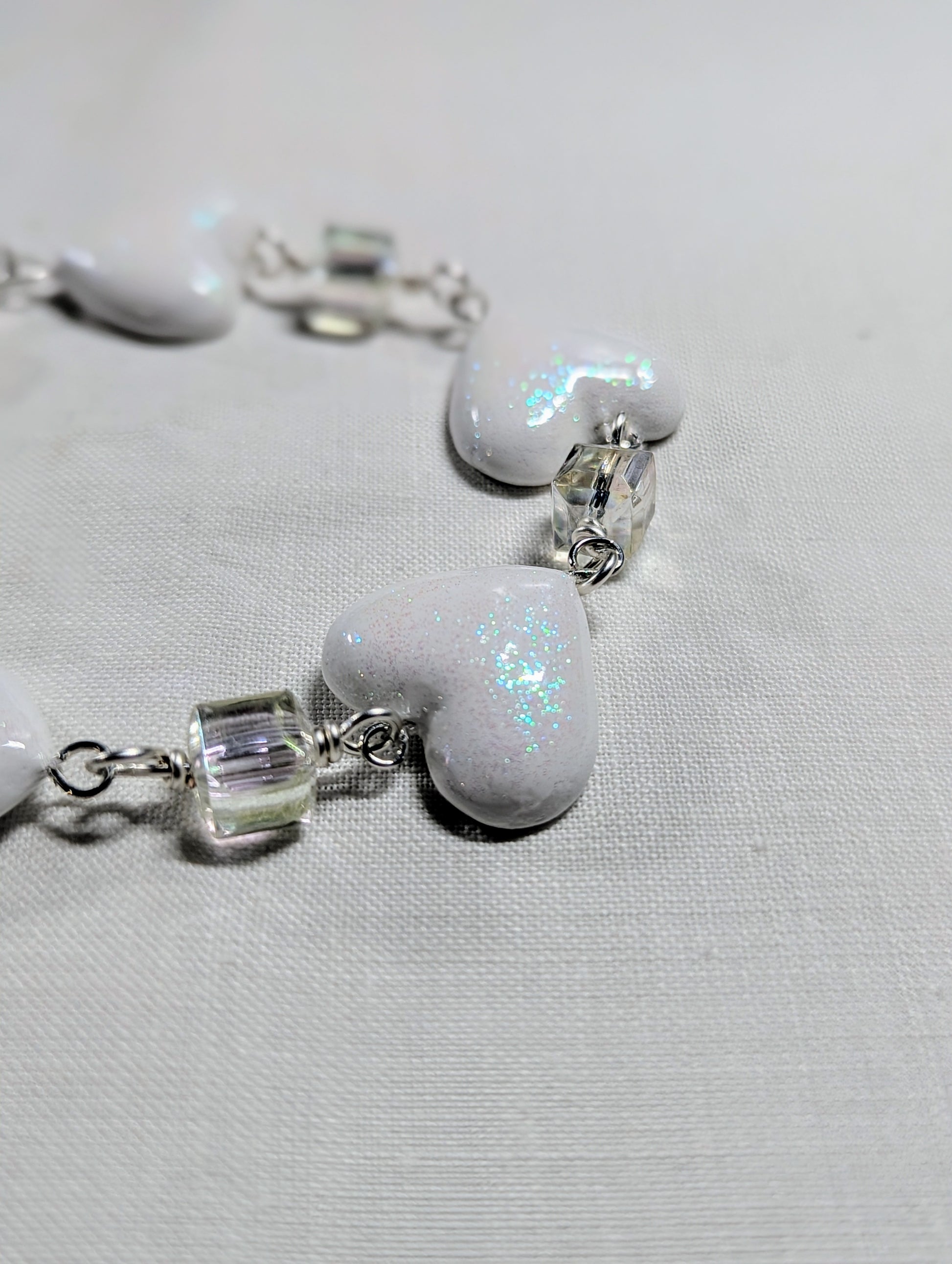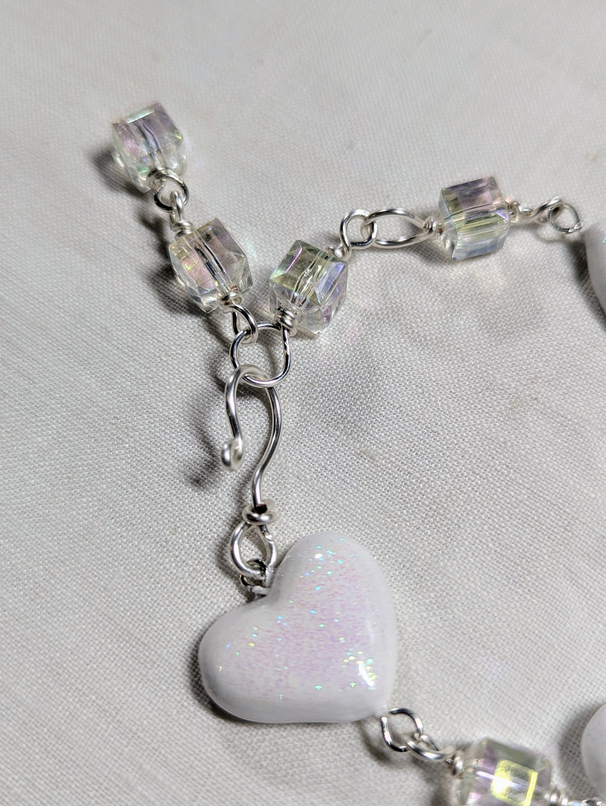 "Add some heart to your outfit with this handmade White Queen of Heart bracelet! Crafted with cute clay hearts and wire-wrapped crystal beads, this accessory is perfect for young adults and adults alike. A whimsical addition to any ensemble. This bracelet is adjustable from size 7 to size 9.